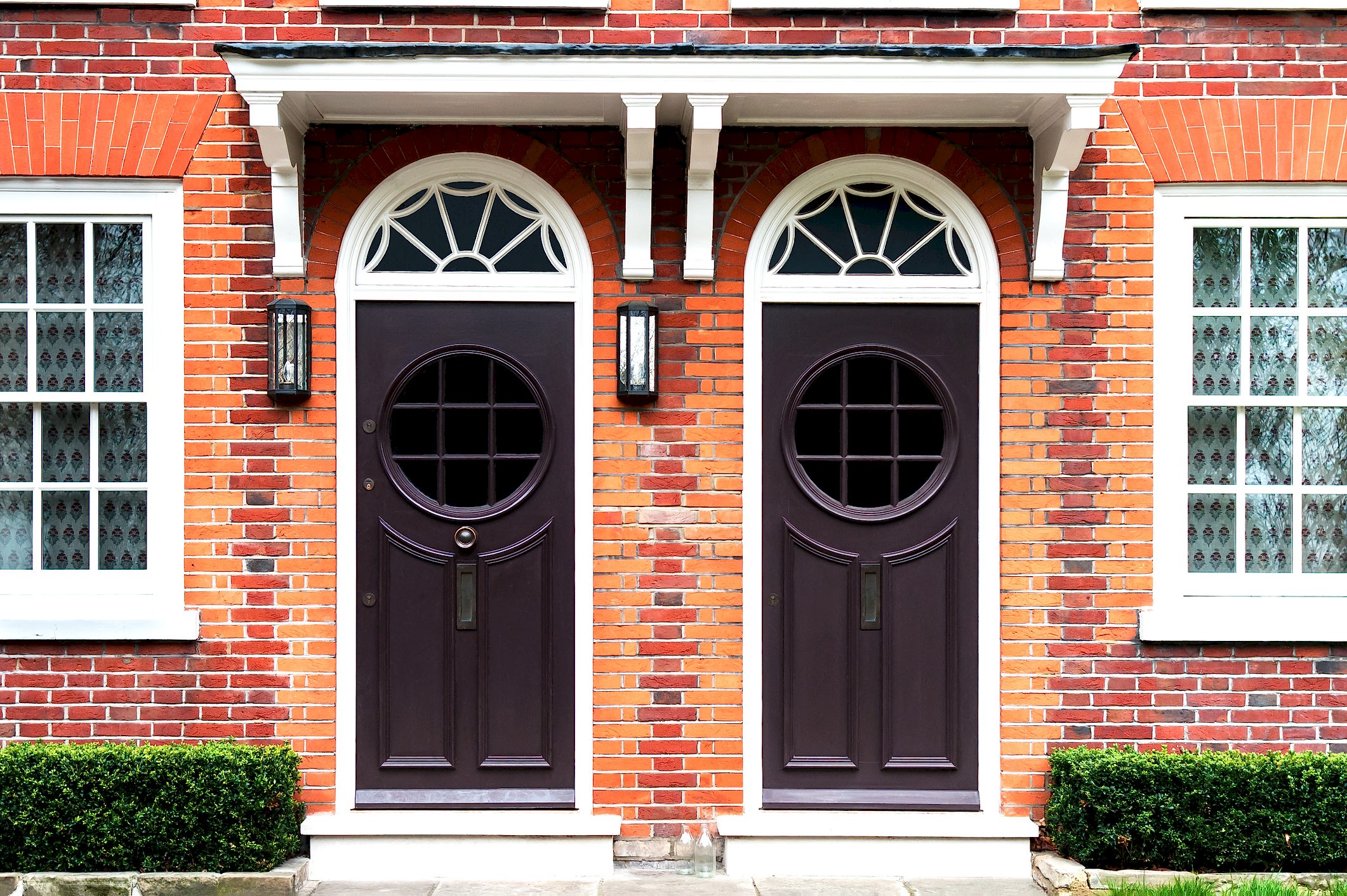 - Twin Arched Dark Doors in Red Brick Wall with White Details